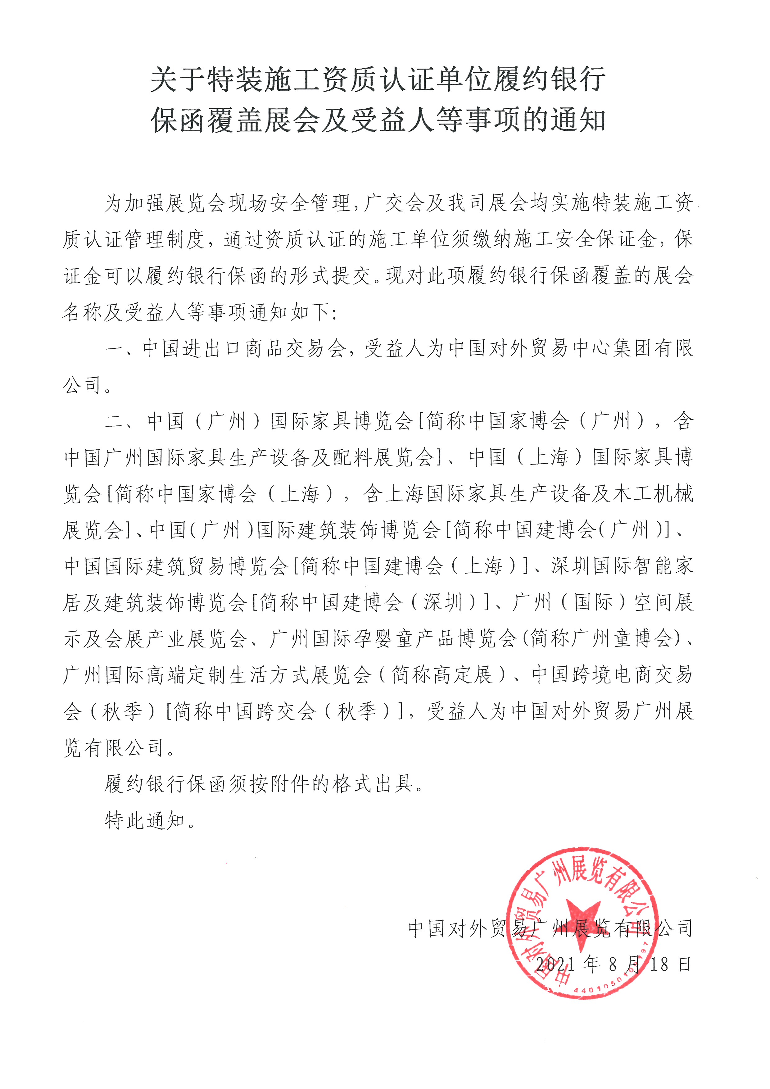 關(guān)于特裝施工資質(zhì)認(rèn)證單位履約銀行保函覆蓋展會及受益人等事項(xiàng)的通知