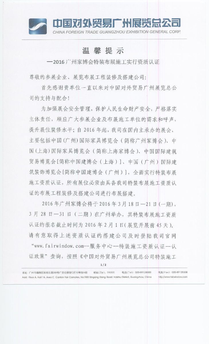 溫馨提醒--廣州家博會(huì)特征布展施工實(shí)行資質(zhì)認(rèn)證