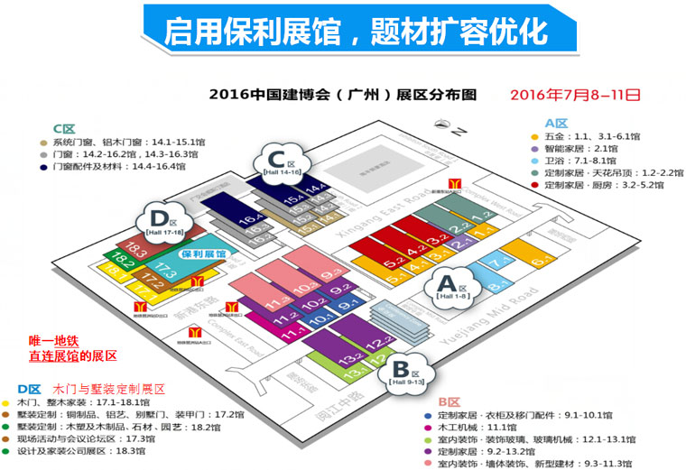 2016中國建博會(廣州)將以兩館(廣交會展館+保利展館)四區(qū)(A、B、C、D區(qū))一體的布局,以更大的展示空間、更科學(xué)的展區(qū)規(guī)劃、更完整的展出題材、更高品質(zhì)的展會服務(wù)為我國建筑裝飾行業(yè)提供一個更優(yōu)質(zhì)的展示平臺,更好地服務(wù)于建筑裝飾行業(yè)。