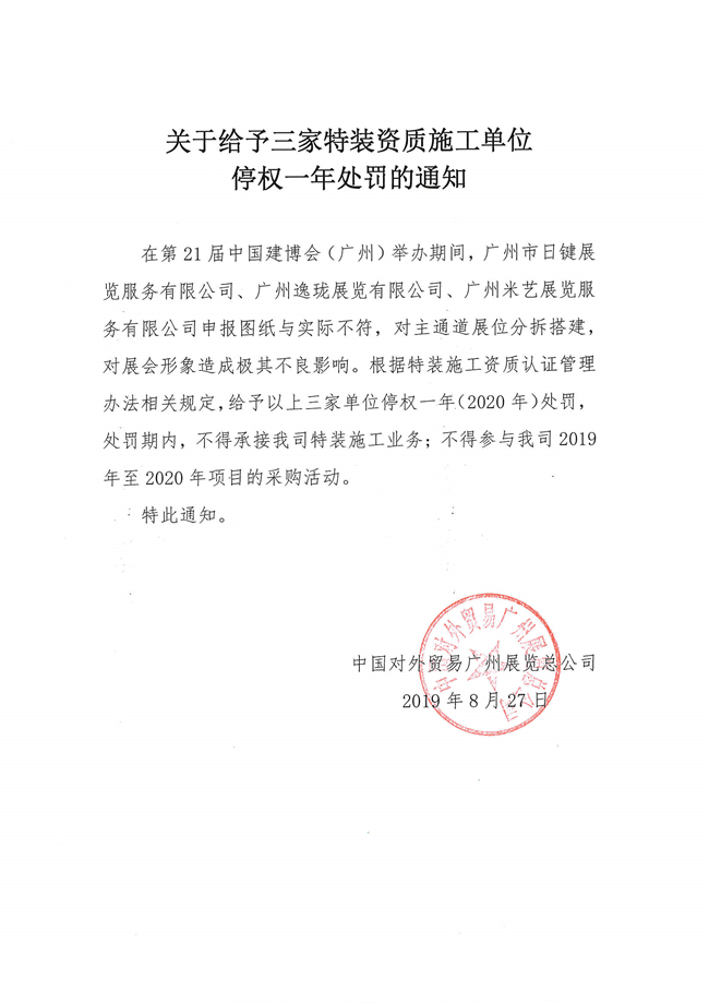 關(guān)于給予三家特裝資質(zhì)施工單位停權(quán)一年處罰的通知